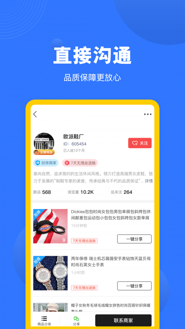 入驻商家自行发布商品,找货批发直接面向厂家,公开多种联系方式,无障碍直接沟通,点对点与商家联系,无任何服务费用,拒绝中间差价。