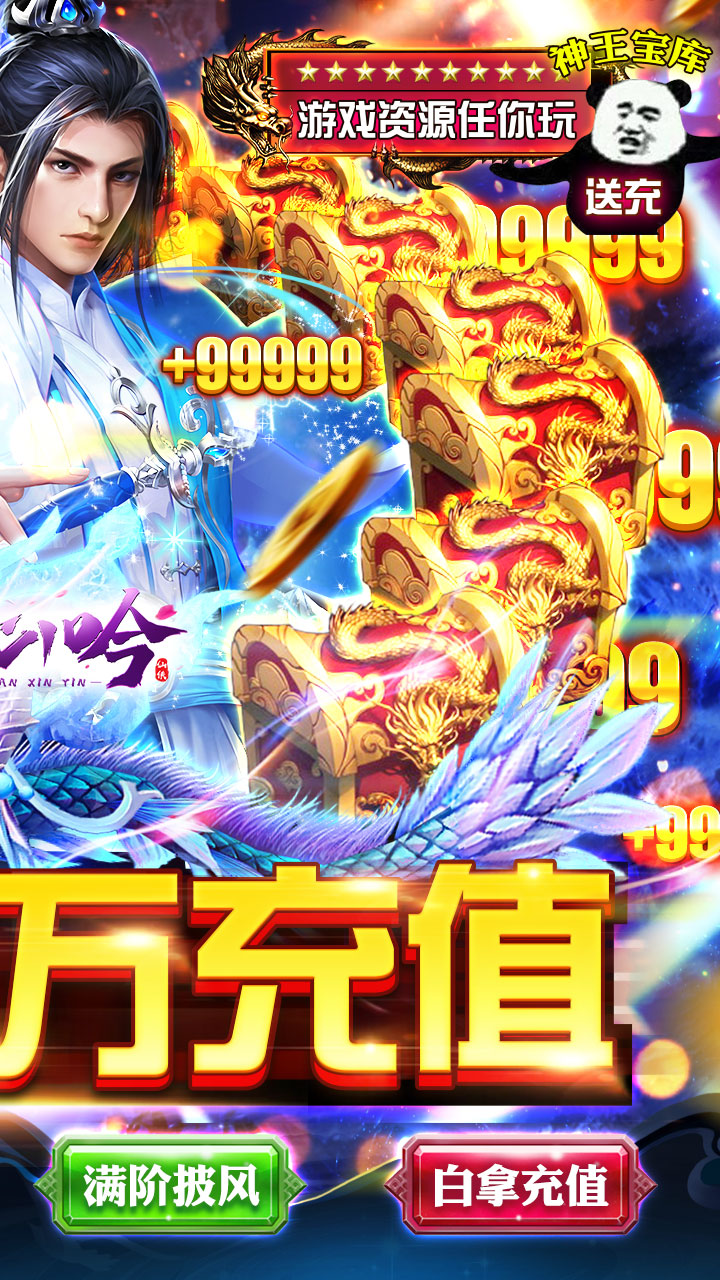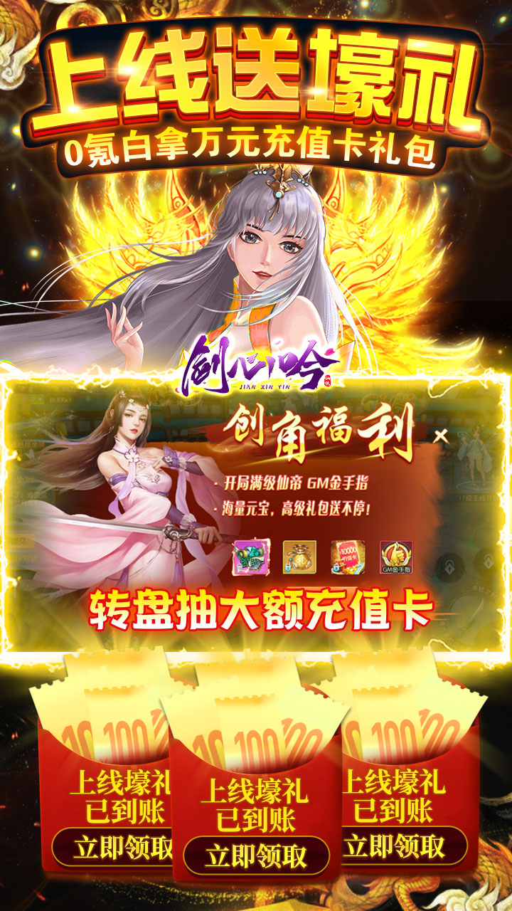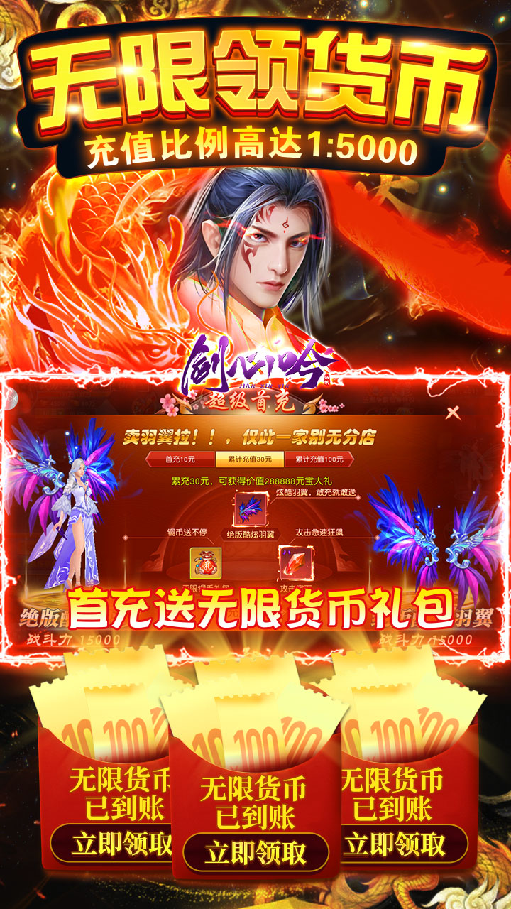 2、上线壕礼:上线送满级仙帝,88W绑元,2亿铜币、0氪白拿万元充值卡礼包,可激活累充活动!
