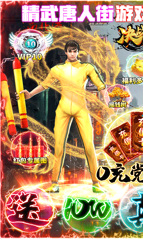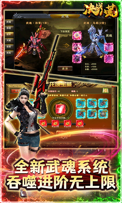 【决战八荒】:赠送VIP10、50W钻石、10亿元宝、精武扬威体验皮肤;再送10万真充卡,增加对应钻石和至尊VIP经验,还可激活每天累充和福运累充,0充党福利正式来临!多种高爆地图,万物皆可爆,全程装备钻石回收,一夜暴富不是梦;全新武魂系统,吞噬进阶无上限,武魂幻化三国英雄人物,各领风骚。