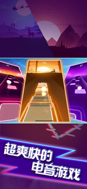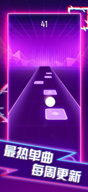 游戏中会根据所选择的音乐随生成赛道,而玩家则需要根据音乐的鼓点让小球在一个个方块平平台上进行跳跃,点击屏幕控制你的小球不断的向前跳跃,掌控好节奏,千万别让球脱离跑道。