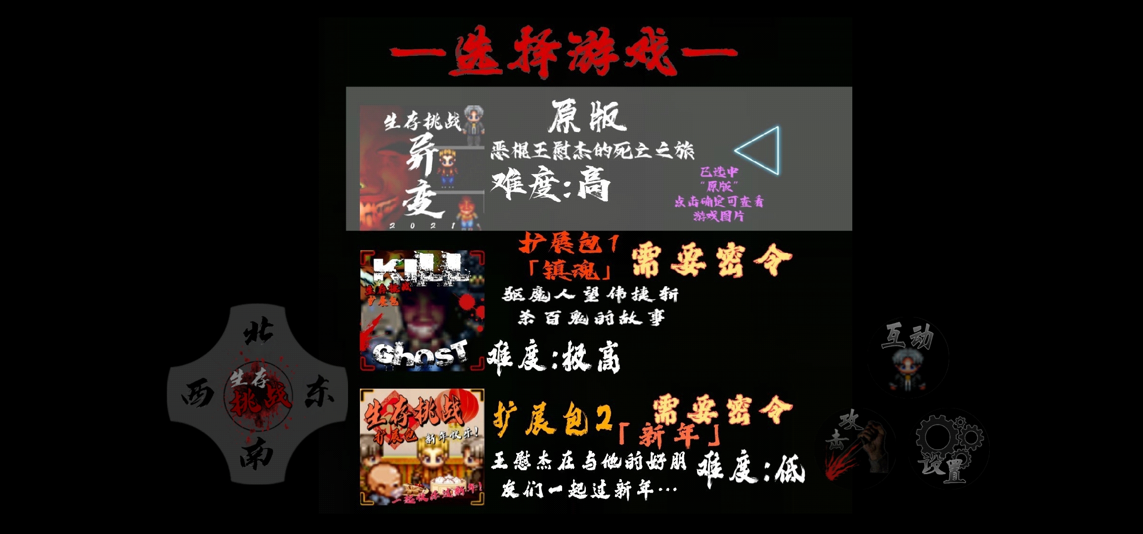 (剧本编辑器制作) 生存挑战一周年加强版1.05 ——更新内容一览—— ①加入选择游戏界面 进入游戏后可以选择你想要游玩的游戏或是扩展包(目前只能玩原版和扩展包1)