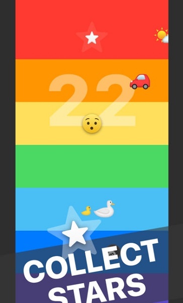 彩虹的场景中会不断出现一些白色的星星,而我们的任务就是通过表情的变换,Emoji上升或者下降从而吃到星星。当然,为了增加游戏的难度,游戏当中还会出现一些类似“汽车”、“鸭子”、“云朵”之类的障碍物,这些都是我们需要极力避开的。游戏并没有所谓的“关卡”一说,但随着分数的提高,场景中的障碍物会越来越多,所以想有所提高,不二法门就是让你的表情更加丰富一些。