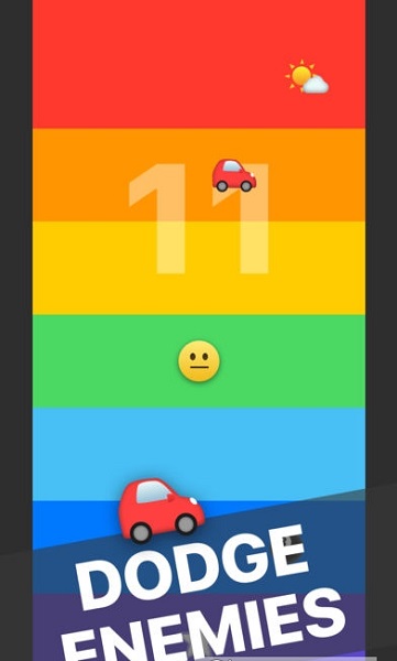 彩虹阶梯中会随机出现一些白色星星,你的任务就是不停变换表情,让 Emoji 上升或下降来吃到星星,同时躲避阶梯上移动的汽车 ??、云朵 ??、鸭子 ??等等障碍物,然后获得分数。