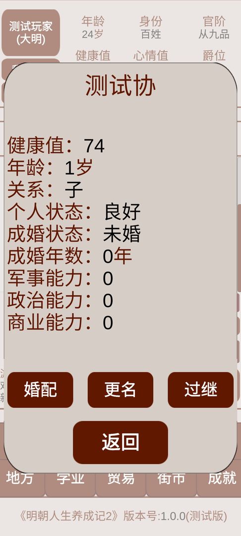 「明朝人生养成记2」以明朝时期为背景,自定义你的出生,根据你创建的人生,你会收获怎样的选择呢?简单的模拟游戏,文字Mud的风格,每次重启都有可能开启不一样的人生走向,触发完全不同的事件走向。