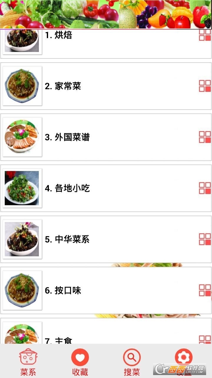 3)外国菜谱:东南亚菜、其他国家、墨西哥菜、意大利餐、日本料理、法国菜、澳大利亚菜、美国家常菜、西餐面点、韩国料理