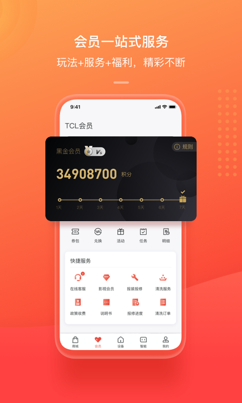 7x24小时贴身服务,定期豪礼发放,为每一位会员提供尊贵的服务。您可以在TCL APP会员页面领取会员福利、兑换积分礼品,乐享好玩有趣的会员活动。还有围绕TCL智能家电的丰富生活和游戏资讯和智家好物,带您发现更多生活智慧。