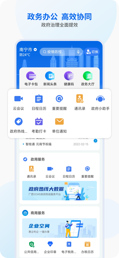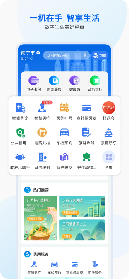 “智桂通”App是以广西全区数字政府基础设施和平台能力为支撑,借助大数据、人工智能、云计算等技术,为广西全区公职人员、企业法人、市民群众、旅游游客打造的移动端综合服务平台。