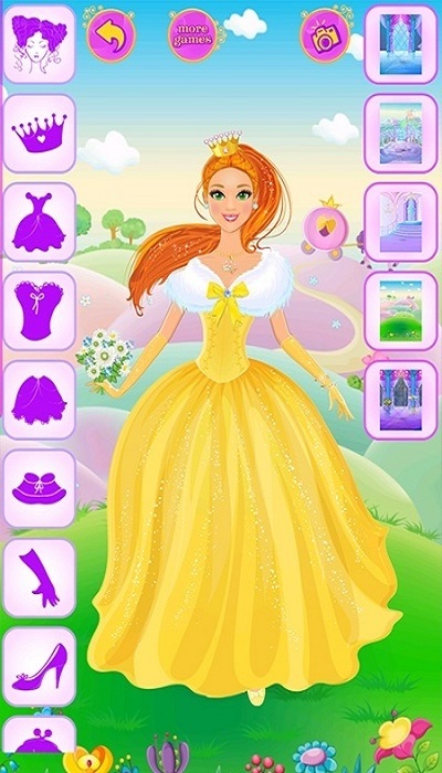 3.换装玩法:玩家可以帮助安吉拉公主选择漂亮的服装、饰品以及发型,让她成为最美丽的公主。