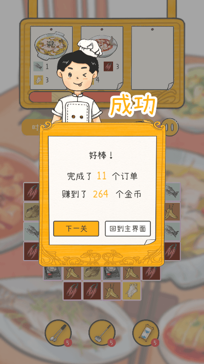 四.消除区域位于下方,你需要根据订单中指定的食材种类和数量进行消除,才能顺利完成订单。