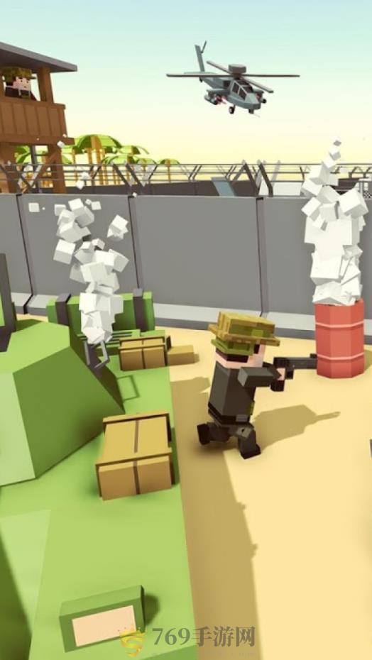 玩家通常处于一个块状的陆军基地环境中。为了赢得任务,他们需要瞄准并射击战场上所有的块状敌人。
