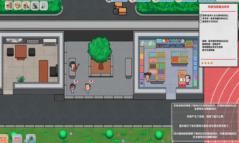 在游戏中,升级时学校需要注意很多问题,学生的分数,高考分数,校园规模等。