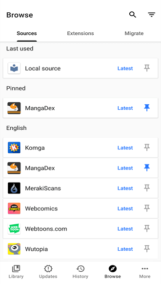 Tachiyomi是一款免费开源的漫画阅读器!Tachiyomi软件上提供免费的漫画资源服务,大量的漫画书可以随意挑选,可以自由搜索自己喜欢阅读的漫画资源类型,还可以将你喜欢的漫画添加到书架上,并有更多的阅读历史记录,方便继续阅读上一次的内容;添加源后还可以将漫画下载到本地哦!