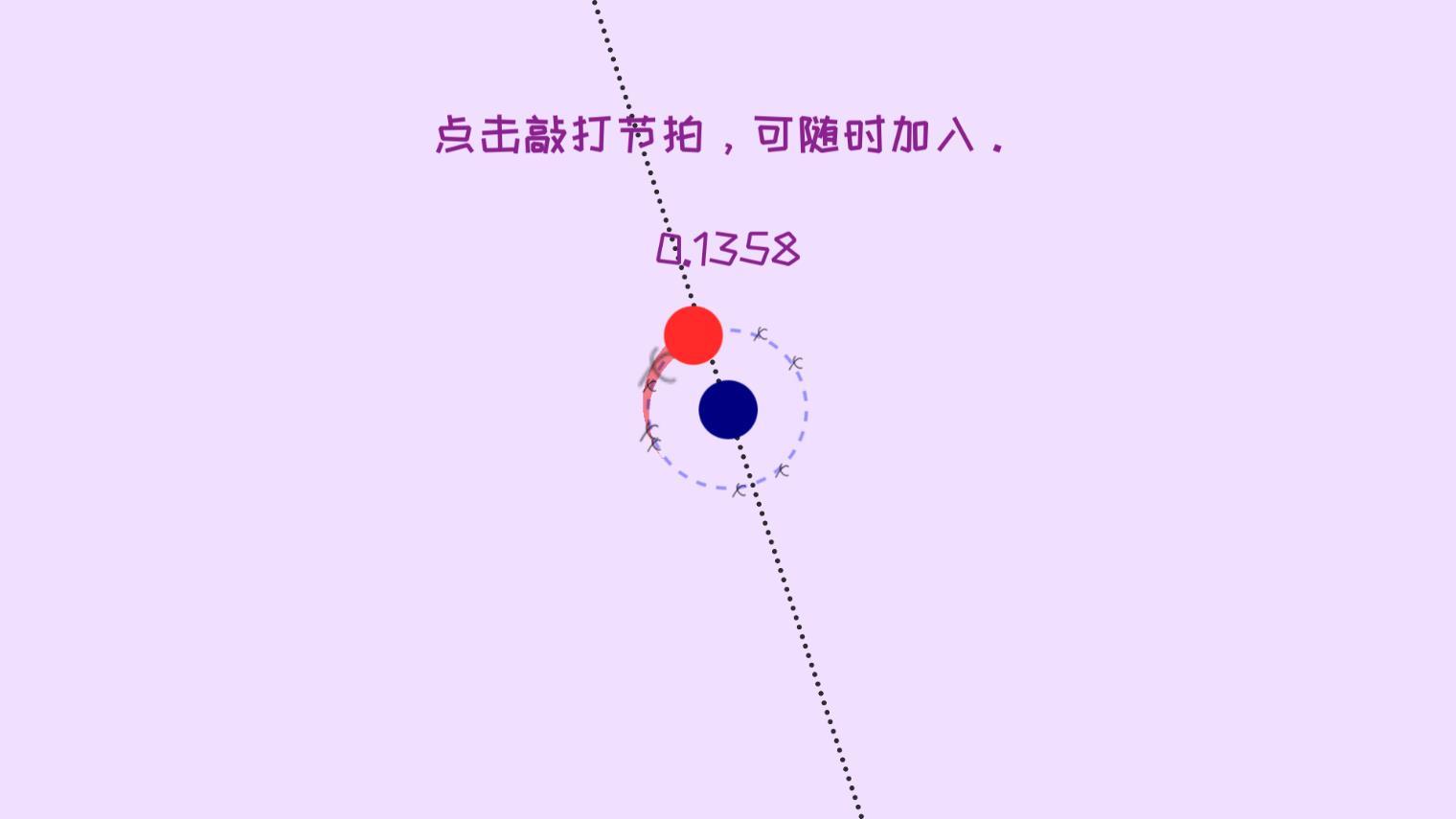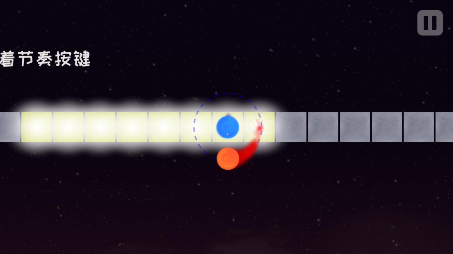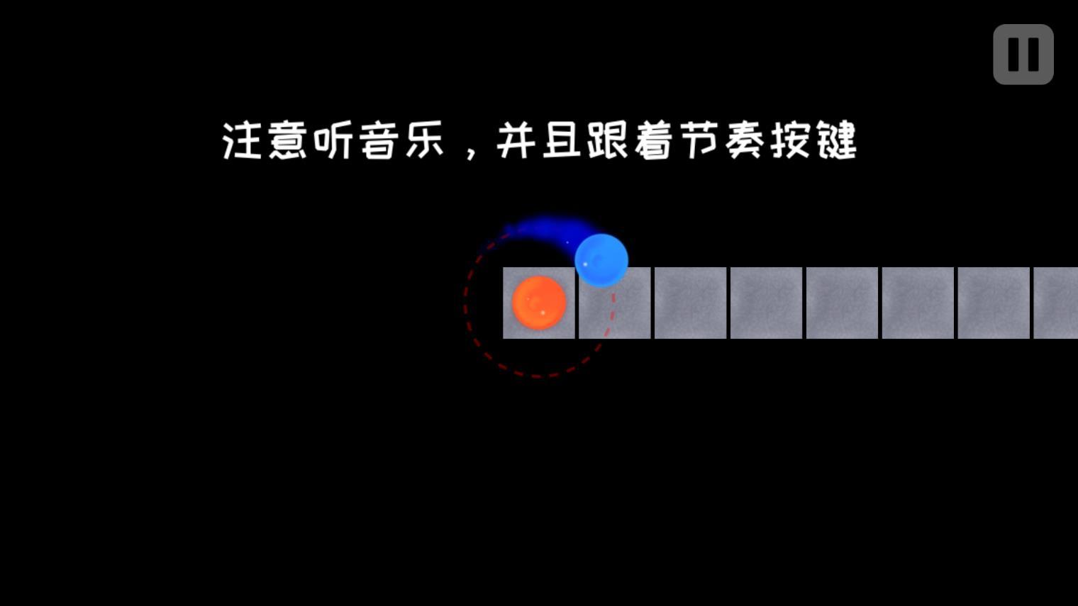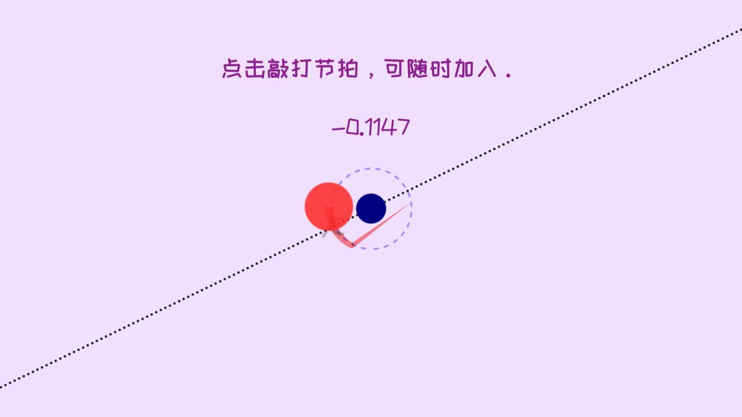 3、点击控制小球走到右边的圆圈里,开始时会有点难,跟上音乐的节奏来按,每次重音点击一下,会控制小球走直线。快半拍则是向上或者向下。