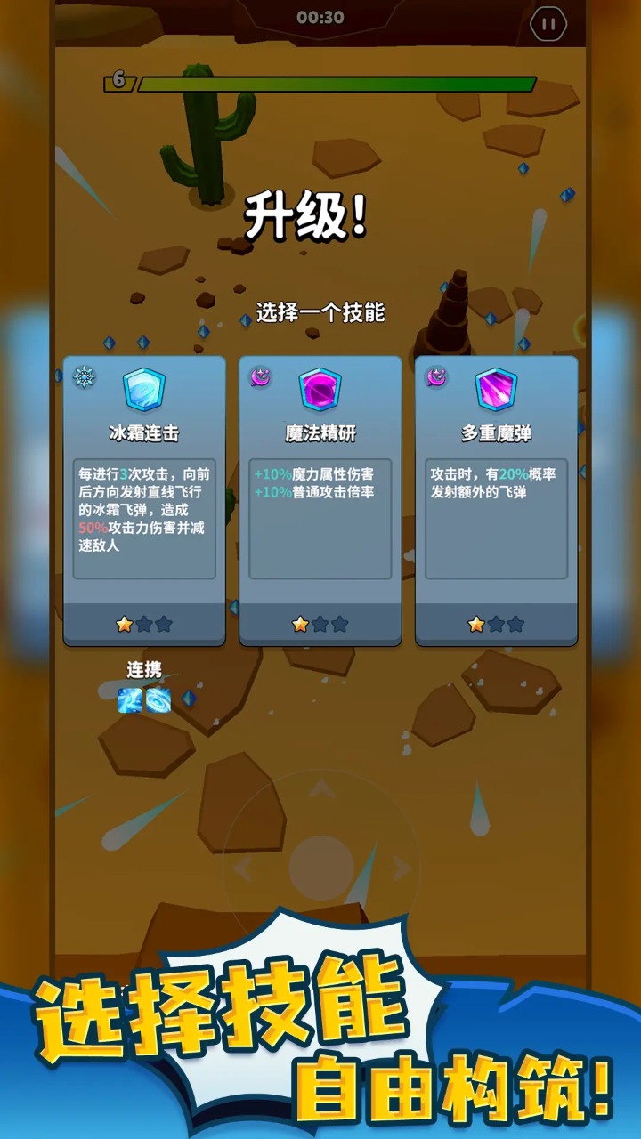 升级的时候会随机出现一些技能,你可以自由的挑选,搭配不一样的组合。