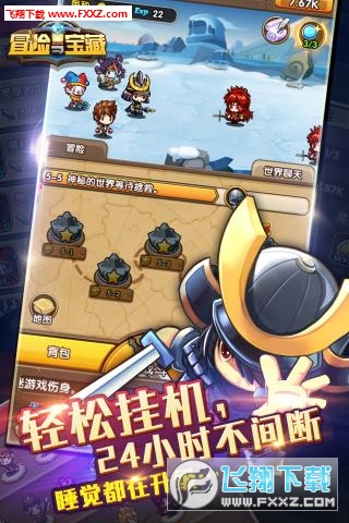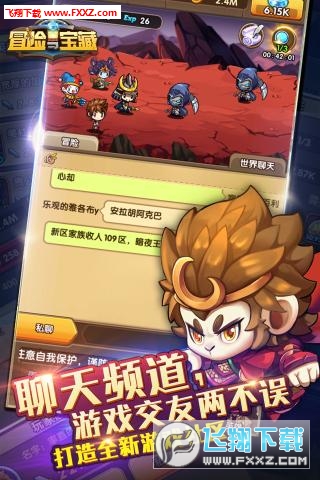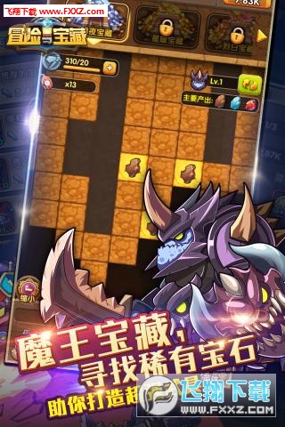 《冒险与宝藏》是一款画面清新,人物,内容丰富有趣的类RPG冒险游戏。不同于其它游戏的玩法,游戏可以24小时不间断升级,更有无限挖矿玩法,升级材料自己挖,一切尽在掌握! 讲述的故事发生在翡翠森林里,魔王带领的邪恶力量侵入翡翠森林,冲破结界,你为了守护翡翠森林,打败魔王,拯救森林里面的动物而开始冒险,在冒险过程中你不仅需要打败被黑暗力量控制的动物们,还需要寻找去矿区挖矿、寻找宝石,提升战斗力。