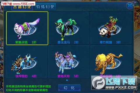 4.坐骑系统,包含坐骑升级,喂养,形象幻化,内丹升级进化的多种玩法,使坐骑不仅仅作为一件玩家的代步工具,更作为一件主力装备来进行培养。
