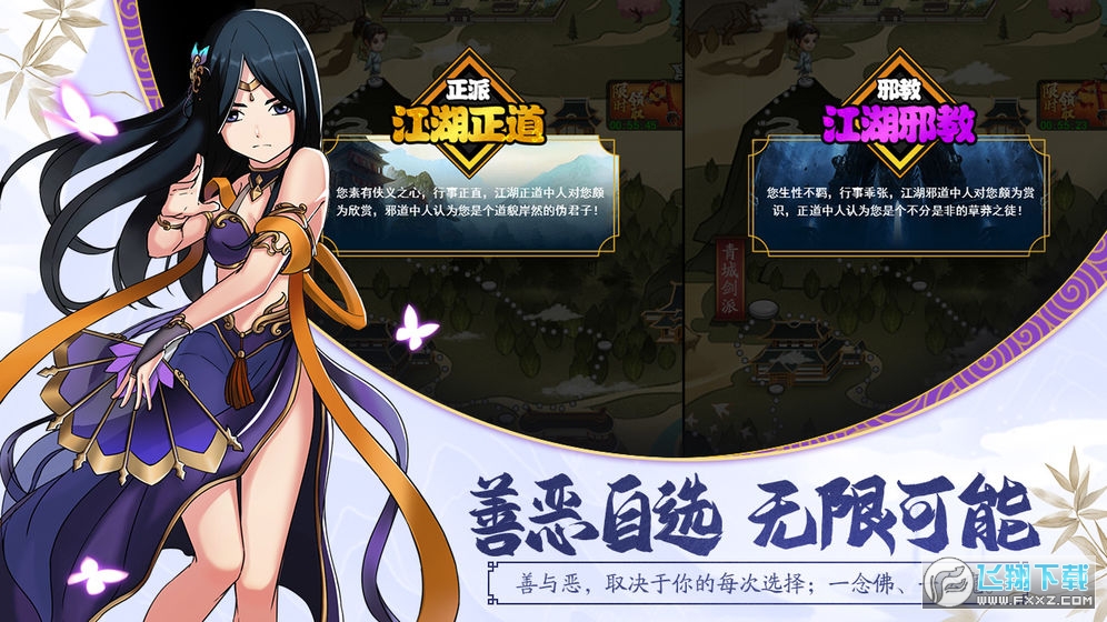 江湖总是多风浪、江湖总是闻名望。作为一派掌门,要时刻关注着江湖:关注着江湖的事件,派遣弟子做选择,不同的选择将会影响这帮派的属性值。关注着江湖的侠客,广纳侠士,为门下弟子增添更多武林绝学。