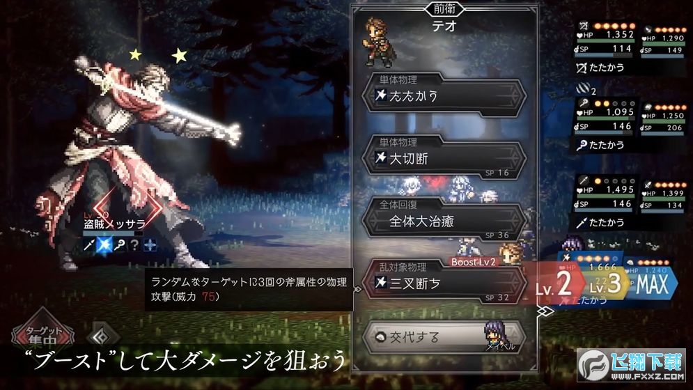 《八方旅人》借鉴了另一部作品《勇气默示录(Bravely Default)》中的“Brave”机制,游戏中名为“Boost”的机制可让角色在一回合内攻击数次,你也可把这一效果留到之后的回合中使用。最多可同时保留4个Boost效果,也就是战斗中角色名称下方的Boost点数“BP”,你还可选择为角色使用Boost的次数。对武器攻击使用Boost效果可让角色多挥动武器一次,比如对装备斧子的角色使用了4重Boost,他就会用斧子额外攻击敌人4次。而对法术使用Boost只会增加法术强度而不是增加施法次数。