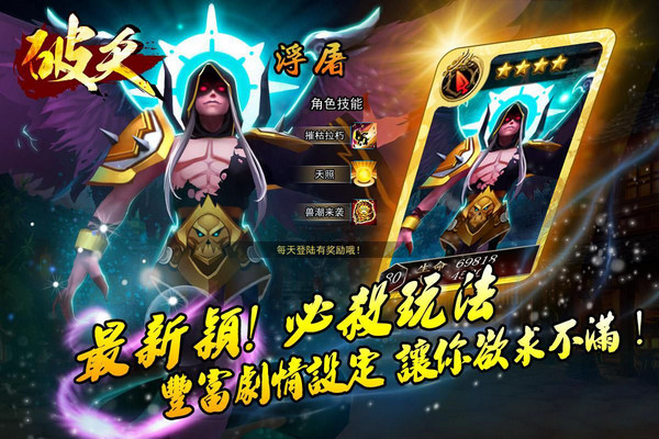 破天是一款丰富设定让你欲求不满的最新颖必杀玩法的回合制RPG手机游戏,角色以造型呈现,玩家们可以召唤各种不同职业的角色,组成各式不同队型进行战斗!