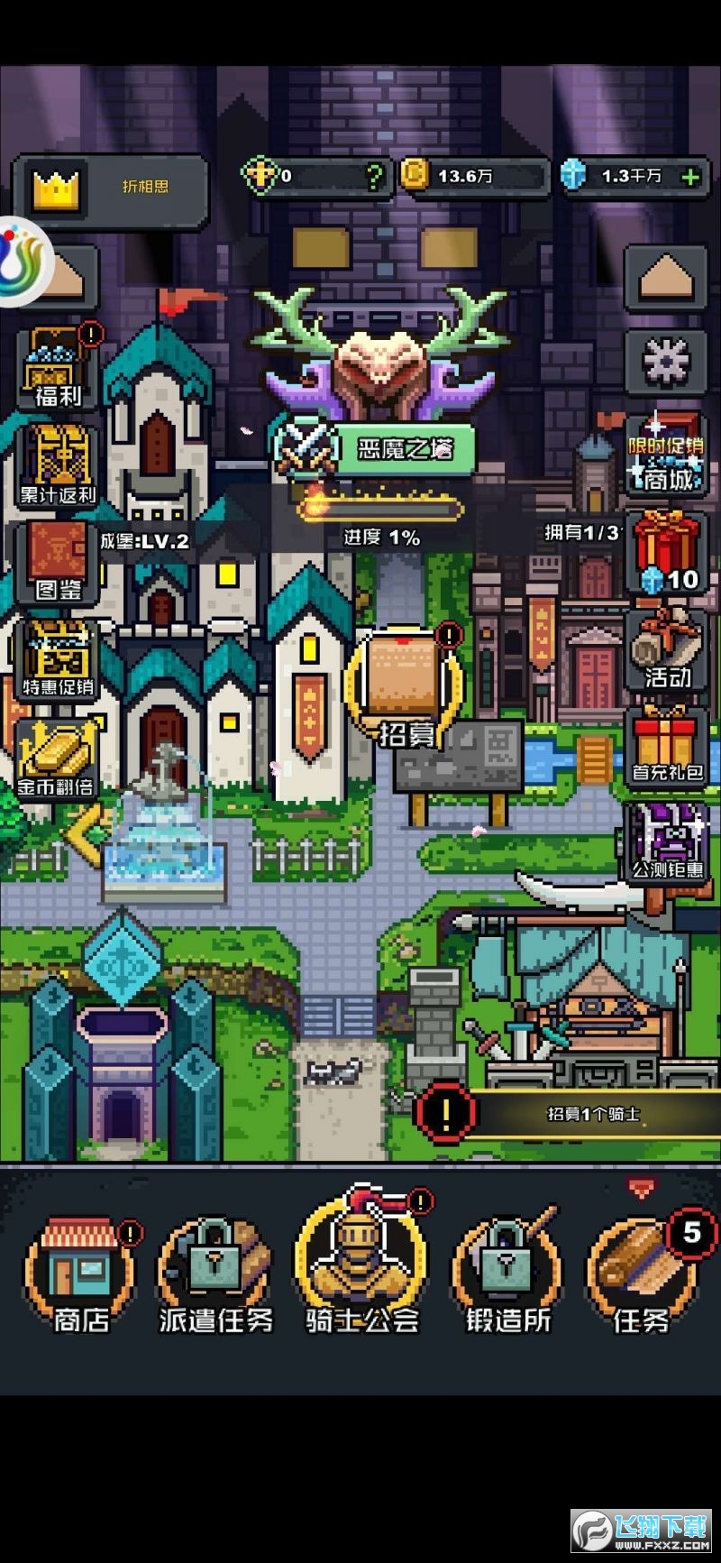 5、打个几轮到达10层把自动战斗跟2倍速解开就行,有一点钱回来去训练升级骑士,之后把任务做完领下成就奖励,基本也差不多有10钻石了,10钻石可以去商店兑换5W金币,有了这5W金币很简单就能通过20层了。