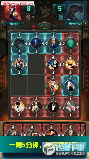 这是一款类的TCG集换卡牌游戏。双方玩家在4×4的棋盘实时对战,所占格子多的一方获得最终胜利。游戏的基本规则与九宫幻卡卡牌相似。卡牌四边拥有不同的点数。当己方卡牌于敌方旁边后,若己方相邻的数字较大,则敌方卡牌变为己方的颜色。您的目的就是尽量将对方的卡牌变为己方,同时不要让己方的卡牌变为对方所有。上手非常简单吧!游戏内有数百张卡牌,不同卡牌的技能组合多样。而且根据出牌的不同的顺序及,对战过程变幻莫测,回味无穷。马上试试吧!