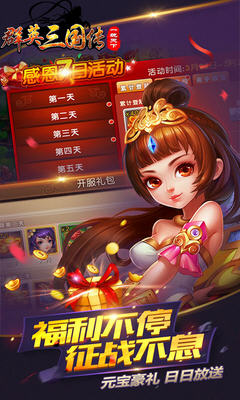 《群英三国传》是史上最具良心的卡牌手游,不仅拥有“武将七星平滑培养设置”、“武将资质上限明确设置”、“神将人人可得设置”等三大良心游戏设定。 同时每天的各类活动,花样繁多,奖励丰富,让玩家在正统三国的游戏世界爽翻天! 三起云涌,英雄集结辈出。
