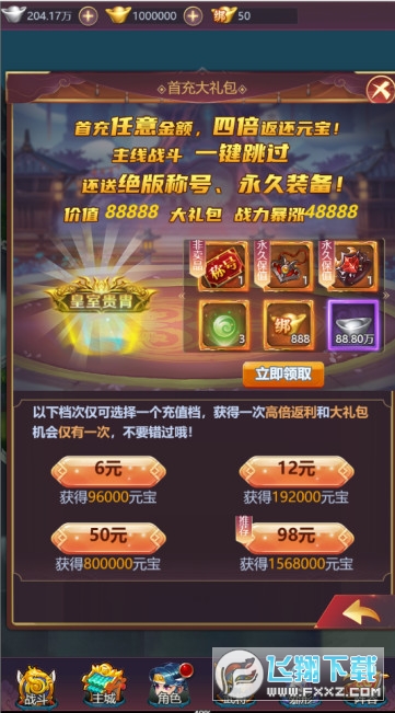 ★后缀说明:游戏内置扶持工具,每日登录和闯关免费获得大量代金券,代金券可全额抵扣RMB直接充值,包括元宝充值、月卡周卡、投资基金和各种礼包等