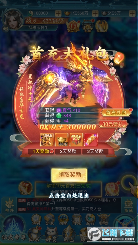 2、活跃度奖励从低到高分别为:200个强化石、40万银两、20万真气、200元宝、1个不朽福袋(集齐999个不朽福袋,可前往不朽转盘中抽取1次SSSR级神级灵兽/道友/坐骑)