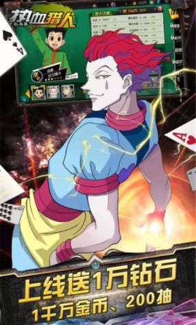 游戏上线赠送真实满级VIP,1万钻石,角色卡池200抽,S级念兽-魔狐。活动奖励送不停,初期即可获得多个S级猎人! 热血猎人(满V版)是一款以动漫全职猎人为题材改变的卡牌手游,经典角色加上经典招式,百种不同的技能搭配,让您真正体验到卡牌策略游戏的纯粹本质。
