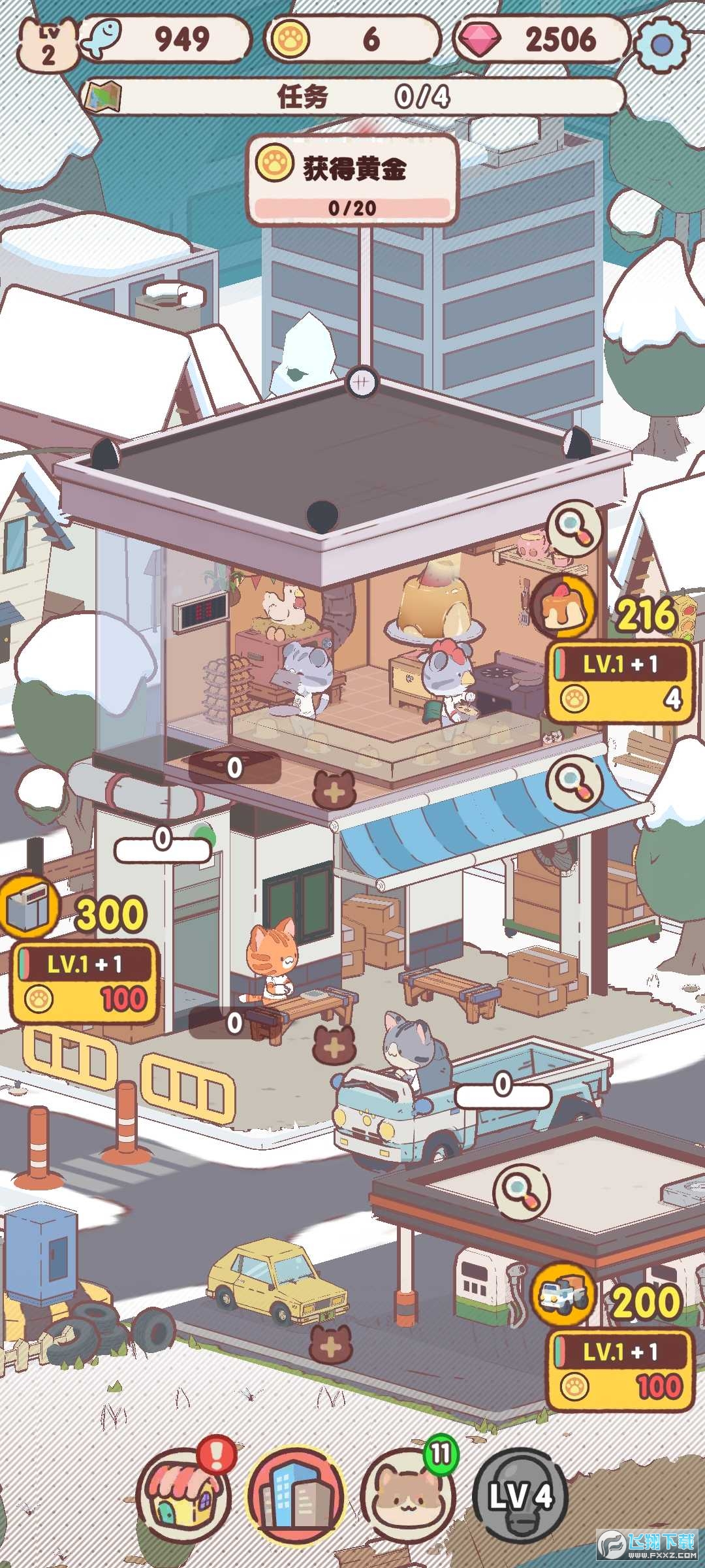 2、每一层都可以不同类型的甜品作坊,非常多的猫咪角色可以让你去选择制作各种各样的甜品。