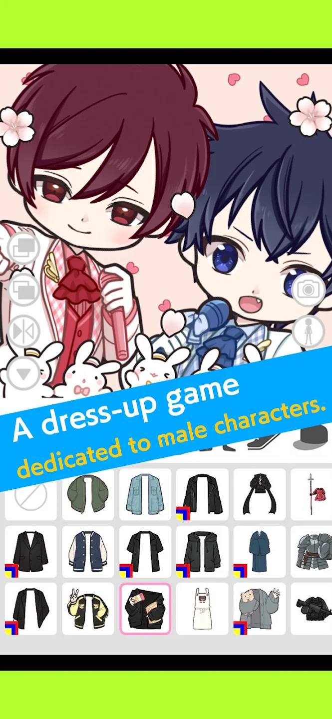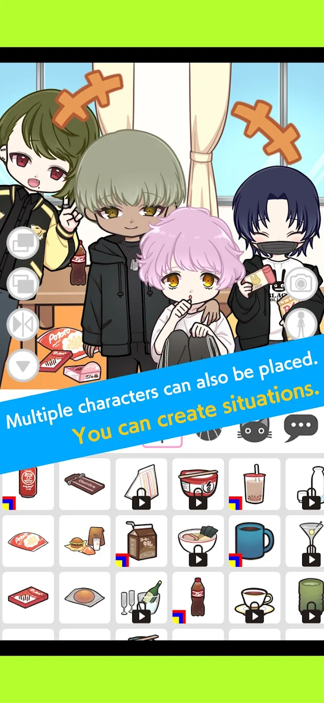 您可以保存您创建的角色和情境,并根据您的心情或事件重复使用它们,从而创建许多装扮。使用此游戏,您可以享受创建自己的原创插图的乐趣。