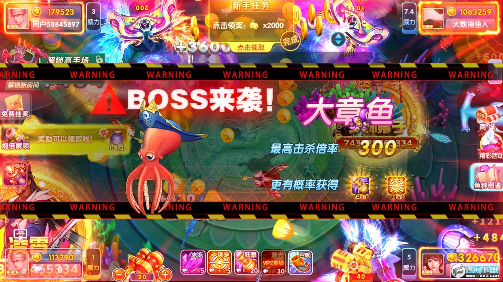 酷炫捕鱼来袭,易燃易爆,告别铁头捕鱼,一炮定乾坤! 酷炫特效高爆率,海量大奖丰富活动等着你!全屏爆炸,冰火巨龙,深海章鱼等丰富的鱼种等你来挑战! 千炮只是起步,万炮不是终点!捕鱼玩法大升级!创新大炮分身系统,给您的炮台加爆率!万倍爆率让您一炮亿金发大财!快来感受非一般刺激、爽快的捕鱼体验吧!