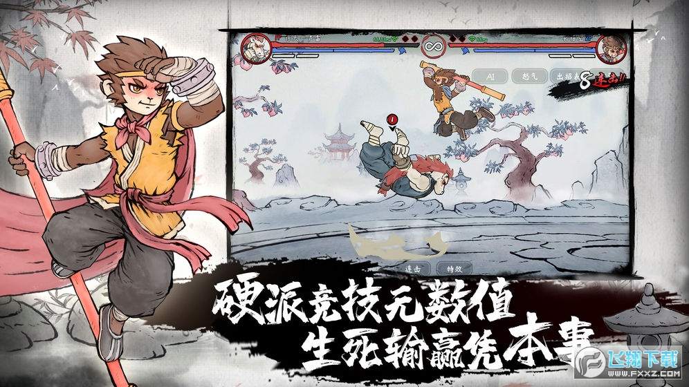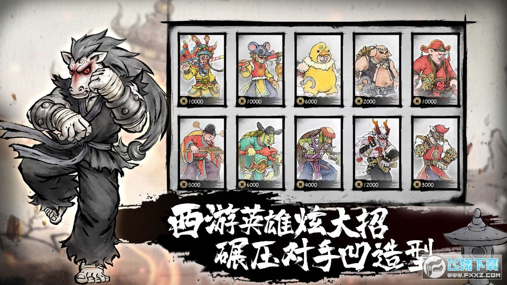 >>水墨西游主题,东方韵味与纯正格斗的独特融合>>无数值养成,几十种连招,生死输赢全凭本事>>12个西游英雄,超丰富的格斗招式>>每个角色多样造型,炫出与众不同