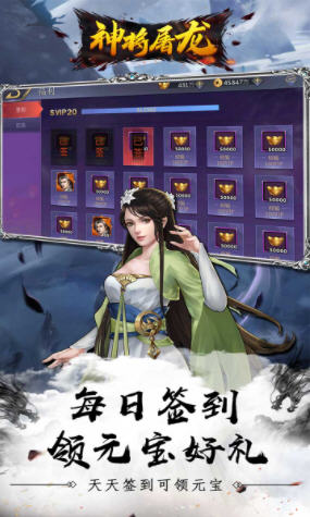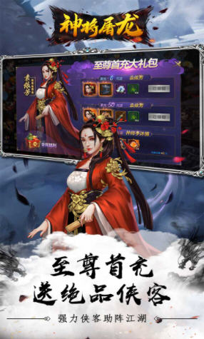 《神将屠龙》是一款类的武侠卡牌游戏,该版本汇集众多玩法及福利,保证让玩家爱不释手。独特的代金券系统,上线登录即送天道侠客,签到还送大量元宝。满V福利直接奖励拿到手软,首冲赠送极品天道侠客,让你横扫前中期毫无压力。完善的跨服系统让你能够与诸多玩家一起纵横江湖,体验刀光剑影下的热血武林。带着自己培养的侠客,一路打上人生巅峰。