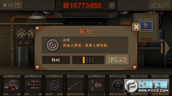 这是一款逃亡的游戏,游戏目标简单明了就是一路向前,越过障碍物和僵尸,不过战车基本上都是撞过去的,我相信不少人都会觉得把僵尸撞得肉末飞溅是这款游戏的非常刺激的画面。游戏的界面和操作也是很简单的,这非常适合新玩家上手。进入游戏界面后,在屏幕的左下角是调节战车重心的两个按键,在中部是战车的仪表,上面显示时速、油量和推进器的燃料量,在最右侧是油门,在战车升级加装推进器后会有一个推进器的油门按钮出现。通过游戏中战车达到的距离获得金币来购买或升级战车的配件,已使战车能够达到更远的地方,直至到游戏关卡的终点,在通过一个关卡后会获得更强大的战车,来应对之后更加恶劣和复杂的道路。