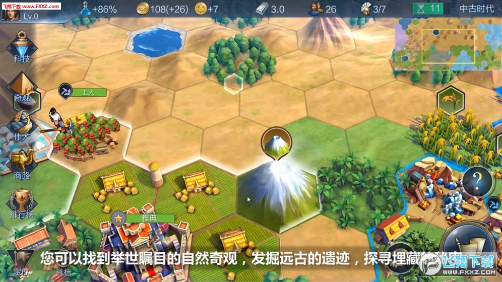 1、借由文明包来自不同文明的领袖,率领自己的文明称霸大陆。每种文明包集特殊的领袖外观、华丽的异域建筑、设施、专属兵种于一体,尽显霸主风采。2、超过100种珍稀文物,让你自带buff闪亮入局。提升单位防守能力、加速科技研发,结合单局发展策略,可组成意想不到的打法。3、5个时代,3种方向,45种科技自由组合,我认真学习起来,连我自己都害怕!4、荒凉的沙漠,丰饶的草原,广袤的大海,不同的地形,决定着城市的未来。5、20+座世界奇观、30+种城市建筑、30+种军事单位、50+位历史伟人,无论你是神龟偷科技流、疯狂爆兵流,都能找到适合自己的打法。6、如果打不过,苟不了,那就造座奇观吧。美美的城市,让你成为整片大陆最靓的仔!
