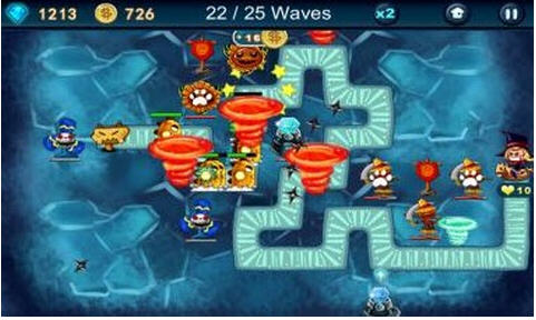 还有障碍全清和怪物全清的挑战,虽然关卡看上去少,但实际上有很多的玩点。在游戏中,杀死怪物可获得一定数量的金币,金币只能在当前关卡升级防御塔时使用,而每关结束后获得的钻石则是用来解锁防御塔和升级防御塔用的。游戏中总共有11中防御塔,每种都有不一样的功能,单攻、群攻、高伤害、分工明确!
