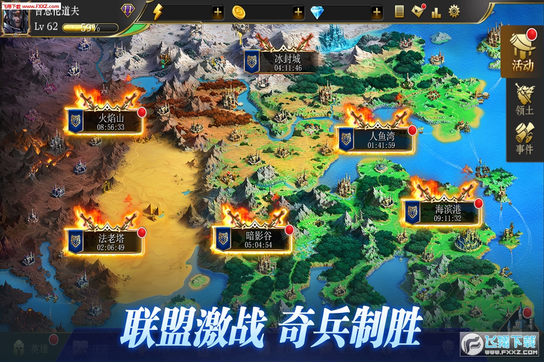 1、增加区域进攻战,需要玩家派出英雄作为指挥官击败区域防守军队,胜利后方可允许进入该区域