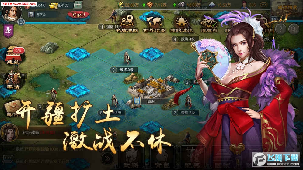 《烽火中原》是一款大型战争策略类手游。游戏中玩法活动极为丰富,包括通天阁、百战千军、琅琊斗将、琅琊会武、聆听传道、将神试炼、过关斩将、辟世神兵、天命合璧、答题、钓鱼、名城争夺战等,另外还有开服活动、每日活动、循环活动等,活动多样,玩家不再寂寞。游戏机制主要分为:建筑部分、武将和装备部分、世界部分、资源部分、士兵部分、联盟部分以及各种玩法。
