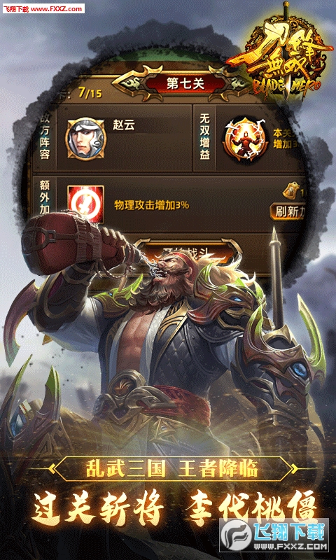 刀锋无双是一款非常经典的三国题材的英雄争霸手机游戏,游戏颠覆传统的三国,丰富的武将还原,个性的人物打造系统,在刀锋无双中,玩家将挑选喜欢的武将,组建军团,攻城,一统天下。