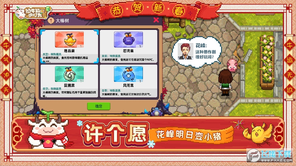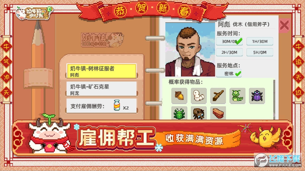 1、像素农场 随心搭建自由打造你的像素农场,不断开拓土地,播种养殖,收获果实资源。自由搭建专属你的全新农场,体验闲暇的农家小时光。2、送礼交心 攻略居民每一个居民都有着一段走心的个人故事,快去攻略小镇的居民,与他们相知相交,培养情感,在日久生情的生活中,寻找到属于你的那位挚爱之人。3、集市 贸易四海各类资源,在集市中和其他玩家以物换物,换取你所需要的物品,让你收集到的所有资源变废为宝。4、创意工坊 加工全新创意玩法,在农场里建设特色小庄园。加工物料,制作美食,分享或售卖你制作的资源,自主经营属于你的庄园。5、钓鱼 奇趣无限去钓鱼赛马,去未知领域探险,还是去矿洞中寻找神秘宝物,在奶牛镇这个多彩缤纷的小世界里,多样趣味玩法,绝对欢乐到爆。