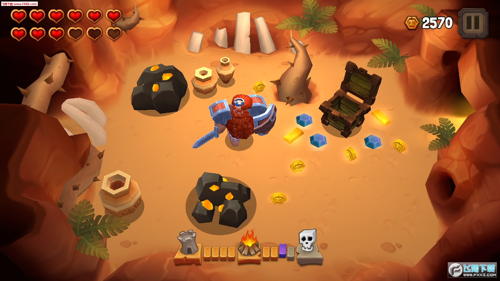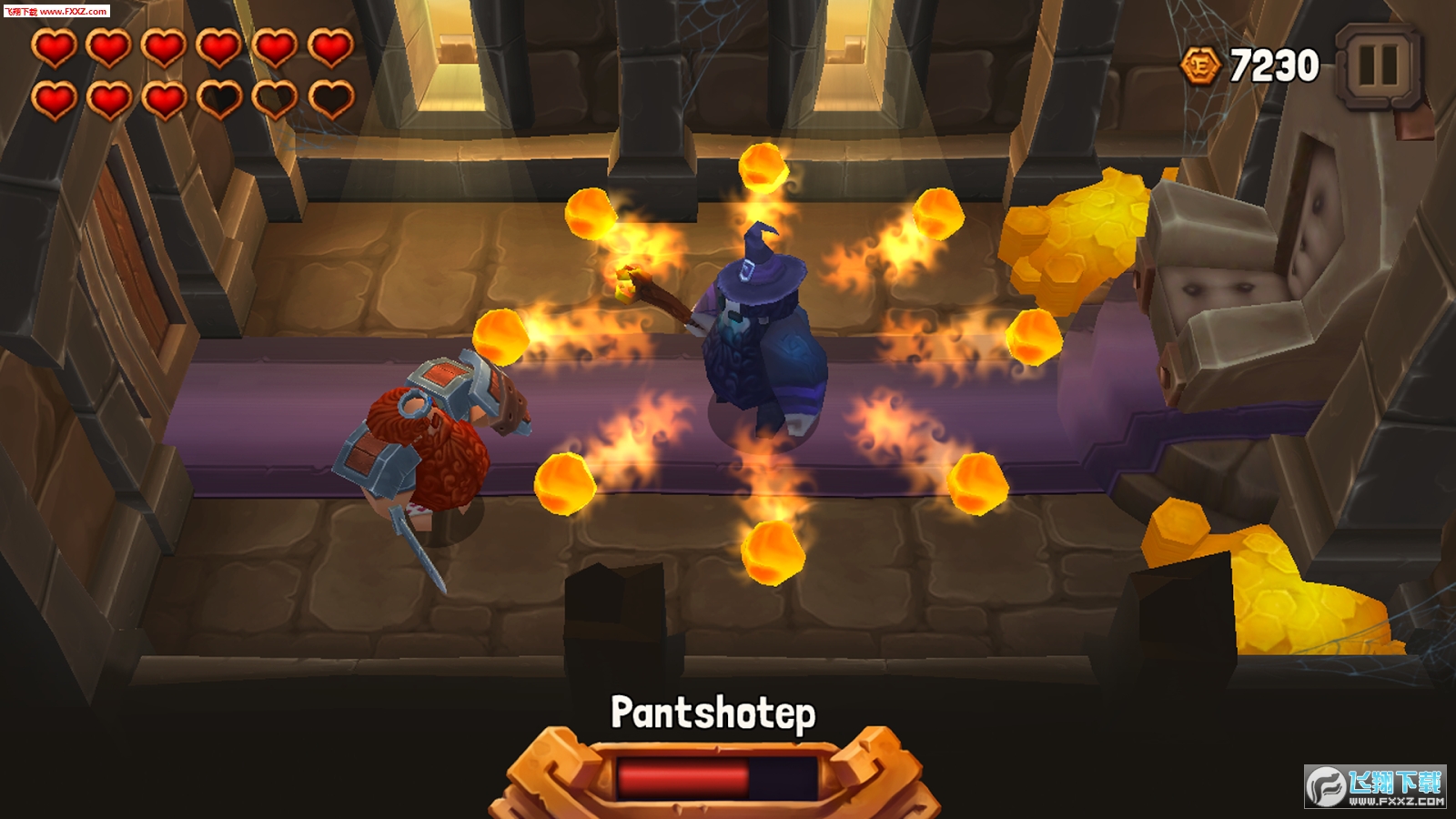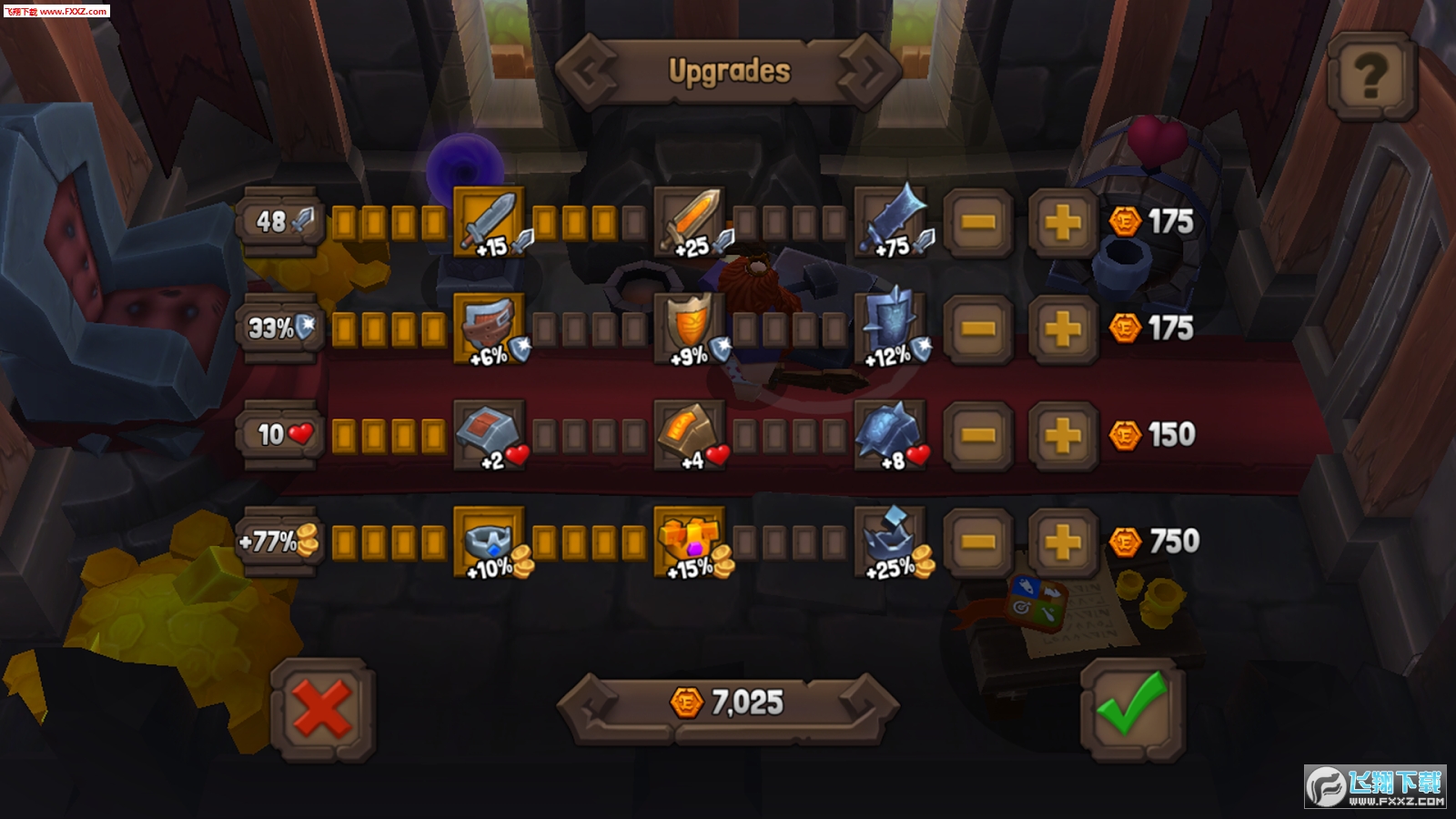 游戏在玩法和操作上也是相对简单,游戏采用摇杆的操控方式,通过左方的虚拟摇杆操纵人物移动,右边的按键控制人物挥砍。作为一款RPG游戏,游戏更强调的是人物的战斗,玩家通过灵活的走位对怪物进行砍杀。而对于装备的设计,游戏做得较为简单,杀死怪物后会掉落金钱。玩家攒够了钱回到城堡中的锻造台对装备进行升级即可。