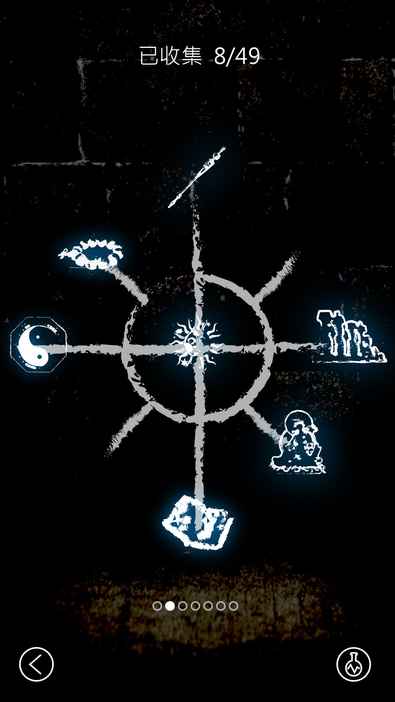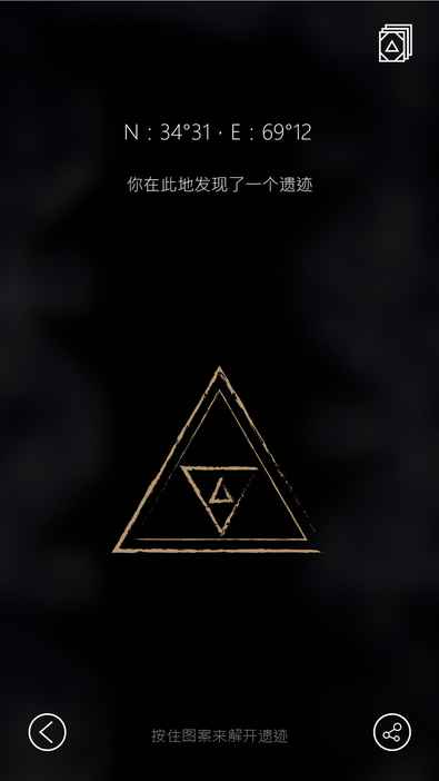 游戏中的箭头是玩家你自己,箭头所指方向是你现在手机对着的方向,旋转手机箭头方向也会旋转,当箭头指着屏幕正上时,你的方向是正对着北方,之后请根据地理知识去寻找遗迹吧。屏幕中的图腾般的点即是遗迹,游戏的一共有7大类49个遗迹,每个遗迹都有自己的故事,把遗迹的故事连起来,又是另一个波澜壮阔的故事。