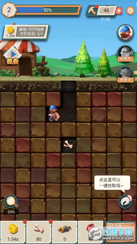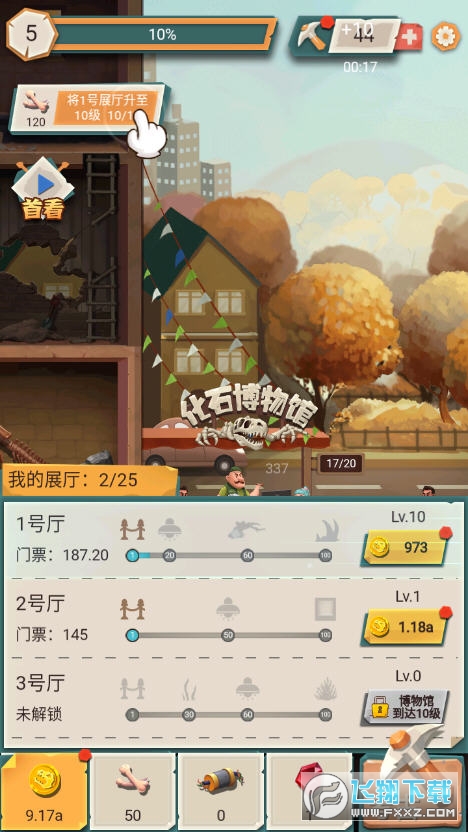 3、游戏主要内容是通过考古挖掘来获取恐龙骨,从而丰富自己的博物馆来吸引游客。