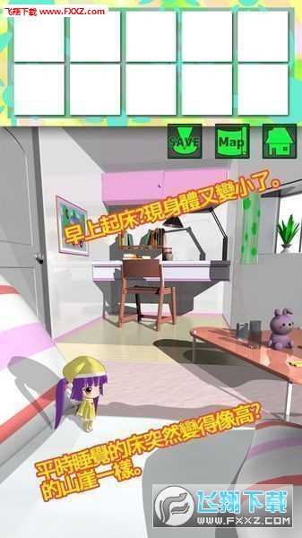 一觉醒来,我发现自己变小了,熟悉的房间摆设,平常随身携带的物品,全部都成了巨大的障碍物,而床上不知名的盒子中,似乎藏着奇怪的药水,看包装的提示,只要我找到打开盒子的钥匙,把它喝掉应该就能变回原型!为了变回原來的大小, 希望屏幕前的你能帮助我进行脱出大!