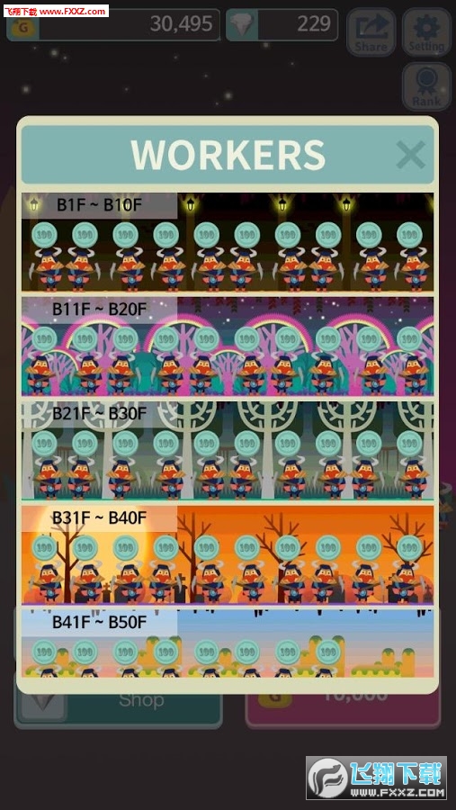 玩家被困在这里,需要打败一层层的妖怪才能够被释放出去。能够代表玩家进行出战的有两个角色,女性角色主要是进行远攻和补血,需要花费一定的魔力值但是不是很多;男性角色则是负责近攻或是连续输出的,但是相对来说花费的魔力值会很多。玩家每解锁一层,就可以安排一个小兵进行金矿的挖掘,挖掘到的金矿可以转化为金币,金币可以用来升级技能或是购买武器。这个部分是类游戏的设计,所以玩家不需要长时间的也能够得到金矿的积攒。升级之后玩家角色的攻击力和防御力都会有很大的提升。此外还有一种资源是钻石,钻石比起金币更加珍贵,也更具有购买力,玩家可以通过攻击怪物掉落来获取钻石。