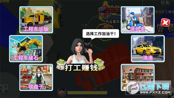 - 可以选择从送外卖、开出租车到搬书、工程车运输、甚至包括收盘子等各种行业的职业,每一项工作都有着自己的特征和难度,并且,随着等级的提高,新工作也会逐渐解锁。