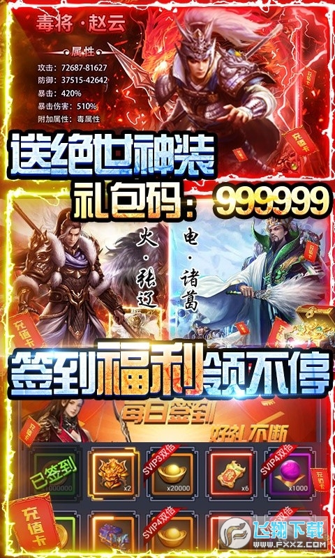 3、上线即送三重豪礼,送银龙赵云!礼包码:666666!送毒奶华佗!礼包码:888888!送绝世神装!礼包码:999999