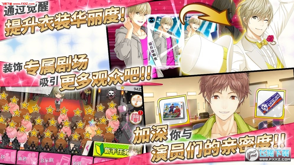 游戏中,玩家将化身为剧本编剧的身份,加入‘梦色剧团’,与7 名男演员一起在剧团中发展音乐剧,每位角色外型、个性大有不同。