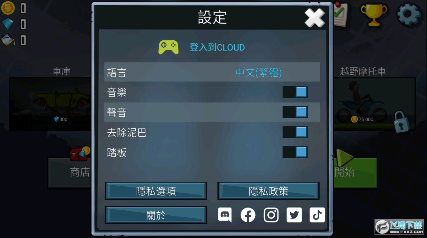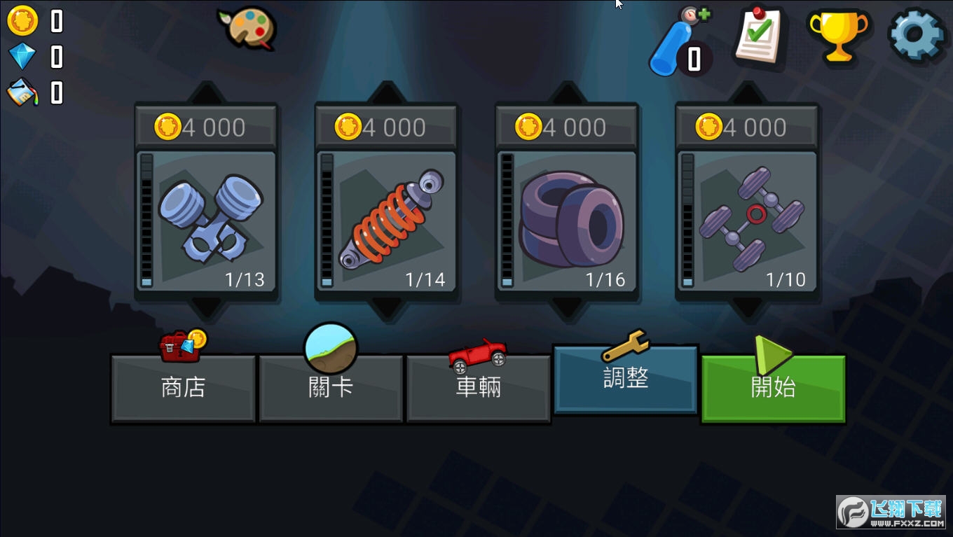 游戏会记录玩家每个关卡到达的等级和最大距离,用获得的奖金可以在在车辆选项里面换新车,不过对一个小游戏也不用指望有什么种类丰富的车可选,总共就三两,一辆普通吉普车,一辆大轮越野车,一辆看起来略牛逼的跑车。此外玩家还可以升级车辆的四大部件,让车子获得更好的驱动力、弹跳和平衡性,争取到达更远的距离。